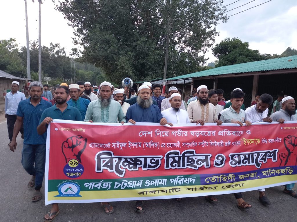 চট্টগ্রামে আইনজীবী সাইফুল ইসলাম আলিফ হত্যার প্রতিবাদে ও ইসকনকে নিষিদ্ধ করার প্রতিবাদে রাঙামাটির মানিকছড়িতে বিক্ষোভ মিছিল ও সমাবেশ হয়েছে।
